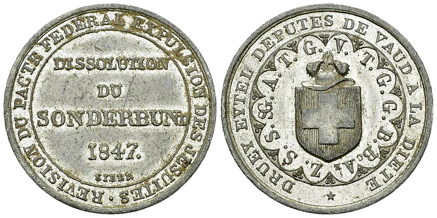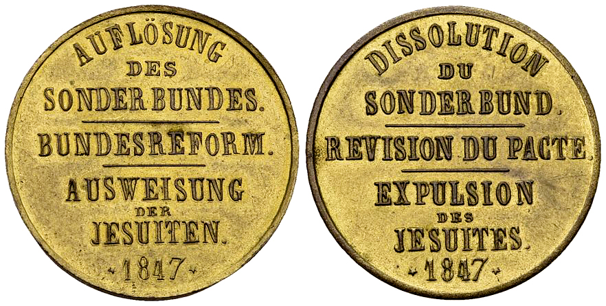 Am 20. Juli 1847 beschloss die Tagsatzung die Auflösung des Sonderbunds, in letzter Konsequenz auch mit Waffengewalt, zu vollziehen. Am 16. August folgte der Beschluss zur Revision des Bundesvertrages von 1815. Dieses Ansinnen hatte über lange Jahre schon die liberalen und konservativen Kantone entzweit. Am 3. September wurde schliesslich noch entschieden, die Jesuiten aus der Schweiz auszuweisen. Diese drei Tagsatzungsbeschlüsse führten dann zum Krieg. Zur Erinnerung an diese Beschlüsse wurde eine Medaille geprägt.