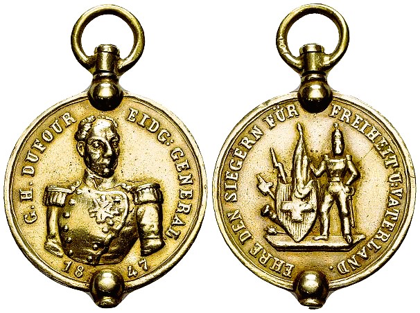 Nach den Freischarenzügen von 1844/45 schlossen sich die Kantone Luzern, Uri, Schwyz, Unterwalden, Zug, Freiburg und Wallis zu einem Schutzbündnis zusammen. Die sieben katholisch-konservativen Stände wappneten sich so gegen eine weitere Bedrohung durch die Radikalen. Dieser Bund, von den anderen Kantonen als Sonderbund bezeichnet, sah auch militärische Optionen vor. Deshalb beschäftigte er ab 1846 die eidgenössische Tagsatzung. Man verlangte seine Auflösung. Alle diesbezüglichen Bemühungen blieben jedoch erfolglos. Deshalb beschloss die Tagsatzung, natürlich ohne die Zustimmung der sieben Sonderbundskantone, dieses Separatbündnis mit Waffengewalt aufzulösen. Im Spätherbst des Jahres 1847 kam es zum Krieg. Diesem einschneidenden Ereignis wurde mit mehreren Medaillen gedacht.