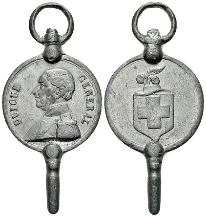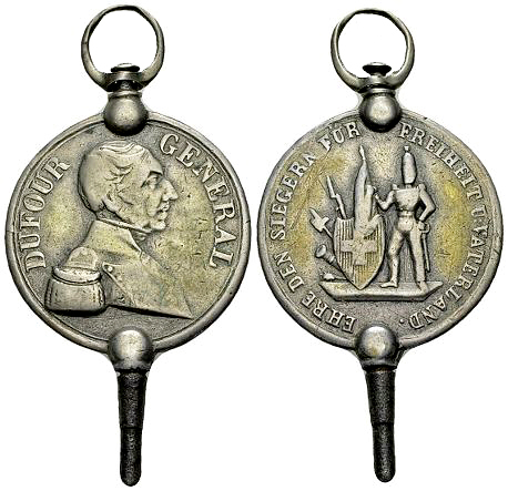 Nach dem Sonderbundskrieg wurde General Guillaume Henri Dufour überall hoch geachtet. Viele Leute wollten zur Erinnerung sein Porträt besitzen. Zu diesem Zweck wurden auch Medaillen geprägt, die dann zu Uhrenschlüsselchen verarbeitet wurden. Denn die damals gebräuchlichen Taschenuhren mussten noch mit einem solchen aufgezogen werden. Die untere Fassung dieser Medaillen weist eine Bohrung mit Gewinde auf. Dies ermöglichte den Austausch des eisernen Vierkantröhrchens, welches zum Aufziehen der Taschenuhr diente.