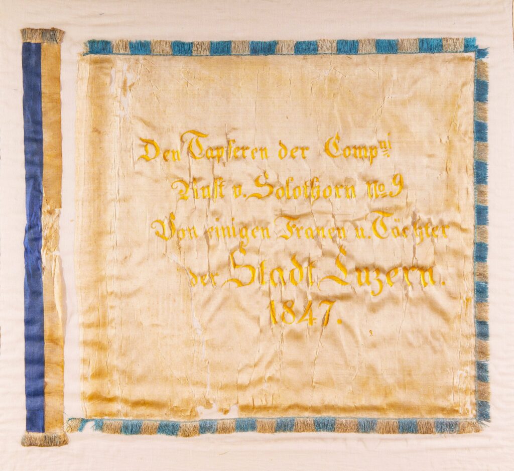 Es wurden ihnen die hübschen Abzeichen, die Fest- und Bankettkarten mit dem Bildnis General Dufours gegen Entgelt von Fr. 3 verabreicht; Blumenmädchen hefteten den Veteranen Blumensträusschen an die ‹Kutten›. Gegen 11 Uhr bildete sich ein stattlicher Festzug: voraus als Avantgarde die obersten Klassen des Kadettencorps, bewaffnet und uniformiert, ihnen folgte die Studentenverbindung ‹Wengia› – und nun kamen 22 weissgekleidete Töchterchen mit Blumenkörbchen und Schärpen in den Kantonsfarben. Fünf Fahnen flatterten im Zuge. Es war da ein kleines weisses Fähnlein, das die Aufmerksamkeit besonders auf sich lenkte und von einem Veteranen getragen wurde; es enthielt folgende Widmung : ‹Den Tapfern der Kompagnie Rust von Solothurn Nr. 9 gewidmet von einigen Frauen und Töchtern der Stadt Luzern anno 1847.›