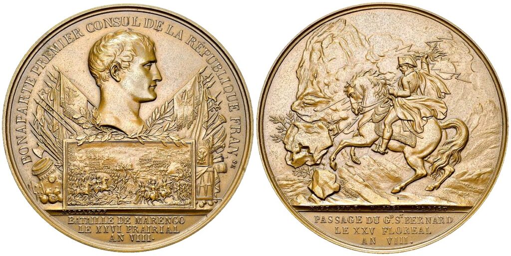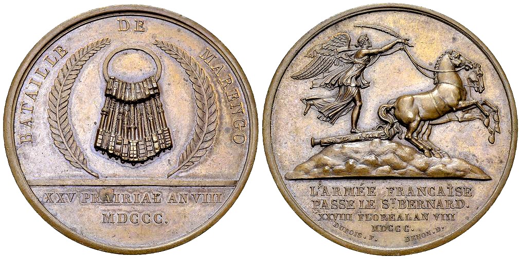 Zugpferde wurden nur auf Medaillen abgebildet, wenn damit eine bestimmte Aussage gemacht werden konnte. So beispielsweise im Jahr 1800. Während des zweiten Koalitionskrieges marschierten die Österreicher in die von Frankreich besetzten oberitalienischen Gebiete ein. Dort setzten sie den französischen Truppen arg zu. Napoleon sah sich gezwungen, einen überraschenden Vorstoss zu unternehmen, um dem Gegner in den Rücken zu fallen. Vom 15. bis 21. Mai 1800 überquerte er mit seiner 45 000 Mann starken Reservearmee den noch schneebedeckten Grossen Sankt Bernhard-Pass. Die Franzosen fielen in Oberitalien ein und schlugen die österreichischen Truppen am 14. Juni 1800 in der Schlacht von Marengo entscheidend.