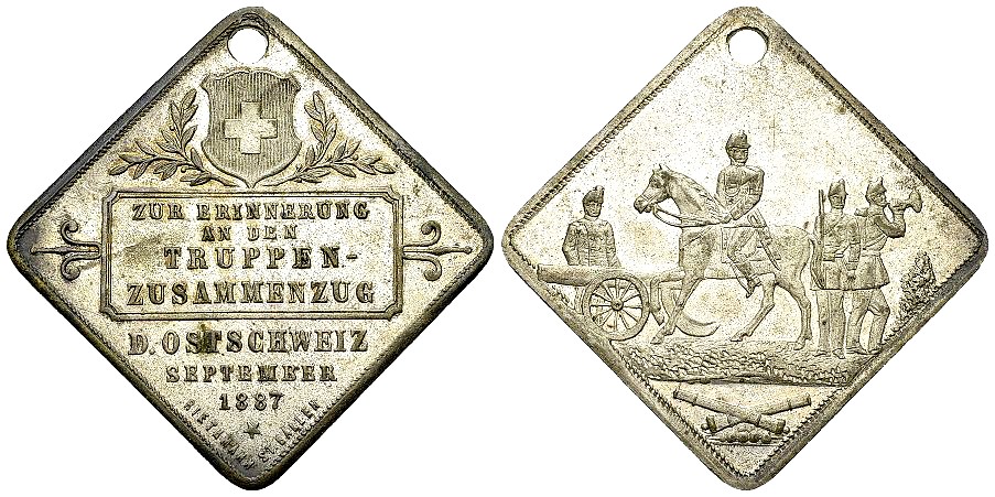 1887 absolvierten die 6. und die 7. Armeedivision einen Truppenzusammenzug im Raum Winterthur–Wil–Frauenfeld. Der Bestand der 6. Division betrug 10 457 Mann mit 1359 Pferden, derjenige der 7. Division 11 941 Mann mit 1720 Pferden. Zur Erinnerung an diesen Anlass gab Walter Rietmann-Rheiner eine Medaille in viereckiger Klippenform heraus. Sie zeigt im Zentrum einen Reiter, links daneben einen Artilleristen hinter einer Kanone, rechts einen Infanteristen und einen Trompeter.