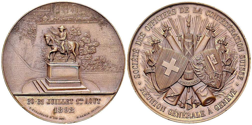Ein Pferd auf einem Denkmal zeigt unsere letzte Medaille. Bei besagtem Denkmal handelt es sich um dasjenige von General Henri Dufour in Genf. Der Genfer Medailleur Louis Jamin wählte dieses Sujet, um eine Medaille zur Generalversammlung der schweizerischen Offiziersgesellschaft, die vom 30. Juli bis 1. August 1892 in Genf stattfand, damit zu zieren. Der offizielle Teil dieses Offiziersfestes bestand aus einer Delegiertenversammlung am Samstagabend, waffenweisen Vorträgen und Verhandlungen am Sonntagmorgen sowie der Generalversammlung am Montagvormittag. Die übrige Zeit wurde den Festlichkeiten gewidmet.