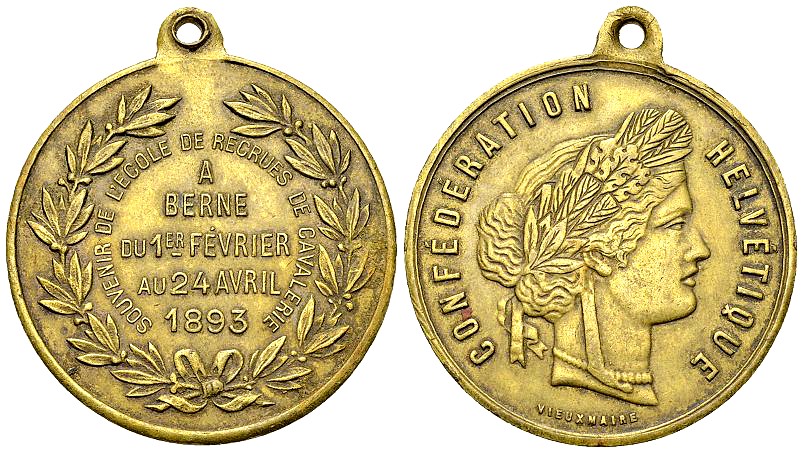 Vom 1. Februar bis 24. April 1893 fand in Bern eine Kavallerierekrutenschule statt. Reiterrekruten aus den Kantonen Genf, Waadt, Wallis, Neuenburg, Freiburg und Bern (Jura) nahmen daran teil. Zur Erinnerung an die Rekrutenschule konnte eine Medaille erworben werden. Hergestellt wurde diese in Frankreich, durch den Medailleur Louis Henri Vieuxmaire. Dessen Medaillen genügten kaum je einem künstlerischen Anspruch. Denn der Medailleur produzierte schnell und billig. Viele seiner Medaillentypen basierten auf einigen wenigen Mustern.