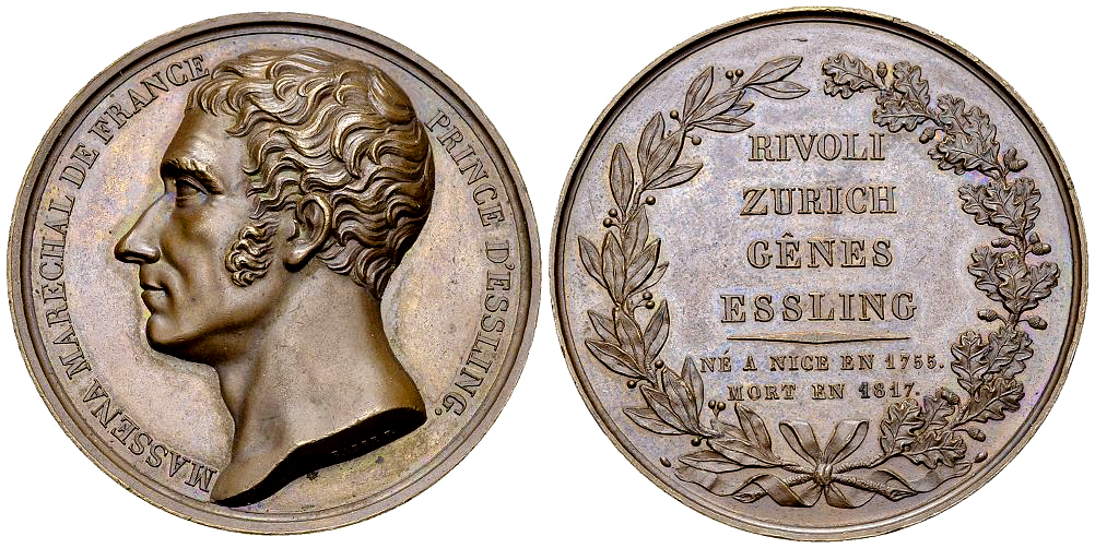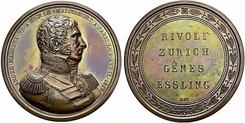 Grosse Medaille auf Marschall Masséna von 1819. Unter seinen wichtigsten Schlachterfolgen ist auch Zürich gelistet. Kupfer, Ø 68 mm, Medailleur: Louis Jaley (Sincona 11-2013, Nr. 1416).