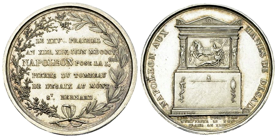 Medaille auf die Beisetzung General Desaixs auf dem Grossen St. Bernhard-Pass, Variante mit Text und Grabmal. Silber, Ø 26,8 mm, Medailleur: Nicolas Brenet (Privatsammlung).