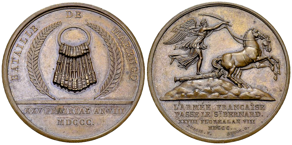 Der Medailleur Andrieu orientierte sich bei seiner Darstellung von Napoleons Übergang über die Alpen ganz offensichtlich an Jacques-Louis Davids bekanntem Gemälde. Nur überquert Napoleon hier nicht eigentlich den Sankt Bernhard-Pass. Vielmehr zersprengt er blitzeschleudernd die Felsen vor ihm. Dieses 1802/1803 vom Medailleur Bertrand Andrieu in Paris hergestellte Medaillon wurde nur als einseitige Prägung gefertigt.
