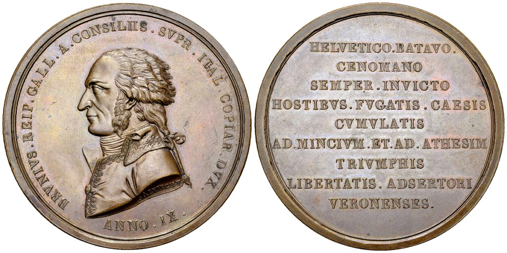 Medaille auf General Brune der italienischen Stadt Verona. Im Jahr 1801 liess die Stadt Verona eine Medaille auf General Brune prägen. Auf dieser wird auch Brunes Erfolg in der Schweiz («HELVETICO») erwähnt. Kupfer, Ø 54,5 mm, Medailleur: Giuseppe Salvirch (Privatsammlung).
