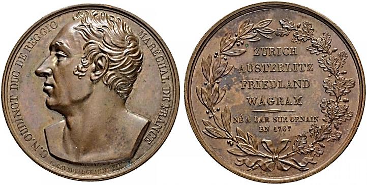 Medaille auf Marschall Oudinot aus dem Jahr 1822. Auch bei ihm ist Zürich unter seinen wichtigsten Schlachterfolgen gelistet. Kupfer, Ø 41 mm, Medailleur: Jacques-Augustin Dieudonné (Sincona 42-2017, Nr. 1392).