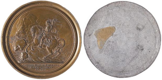 Medaille auf die Überquerung des Grossen St. Bernhard-Passes durch Napoleon. Blei/Zinn bronziert, Ø 68 mm, Medailleur: Bertrand Andrieu (Musée Carnavalet, Paris, Inv. Nr. ND2660).