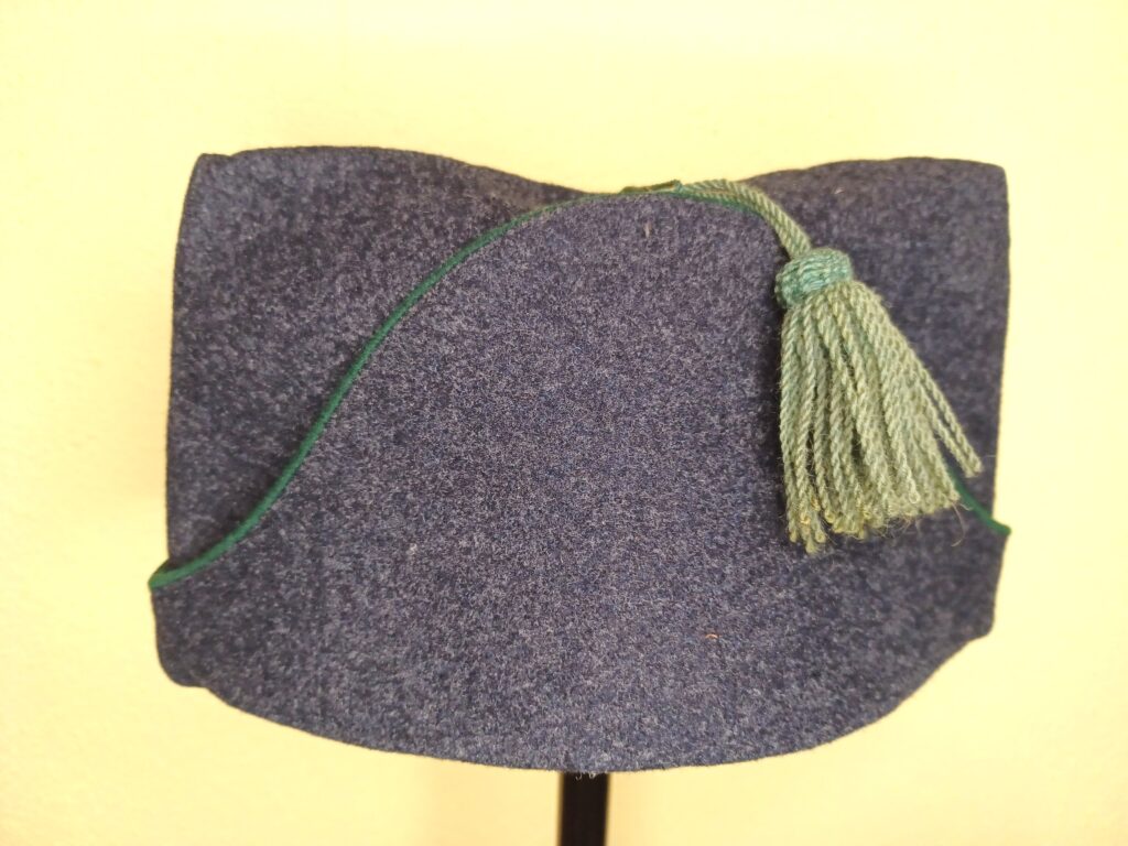 Bei der Feldmütze wissen wir, dass Merz sich diese erst nach 1898 zugelegt hat. Denn vor 1898 waren die Feldmützen der Stabsoffiziere, also der Offiziere vom Major aufwärts, mit einem Kopfrand aus schwarzem Samt versehen. Unsere Feldmütze besitzt keine solche untere Einfassung aus Samt, muss also nach 1898 gefertigt worden sein. Sie besteht aus dunkelblauem Tuch und besitzt hellgrüne Vorstösse. Die kleinen Knöpfe des Kinnriemens sind silbern und mit einem eidgenössischen Kreuz im Strahlenstern versehen.