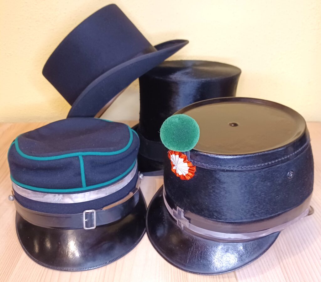 Bei den beiden zivilen Kopfbedeckungen handelt es sich um Zylinder, wie sie damals von Männern der «besseren Gesellschaft» getragen worden sind. Als Kantonsförster, bzw. eidgenössischer Forstinspektor war Merz Mitglied dieser sozialen Schicht. Der eine, niedrigere Zylinder, trägt den Stempel eines Hutgeschäfts in Bellinzona. Merz war von 1889 bis 1909 im Tessiner Kantonshauptort wohnhaft. Als Tessiner Kantonsförster fühlte er sich wohl verpflichtet, bei seinem Hutkauf einen lokalen Lieferanten zu berücksichtigen. Der zweite Zylinder trägt hingegen den Stempel eines Berner Hutgeschäfts. Er dürfte von Merz somit erst nach seinem 1909/10 erfolgten Umzug nach Bern erworben worden sein. Im Innern dieses Zylinders findet sich in Goldbuchstaben das Monogramm «FM» von Friedrich Merz.