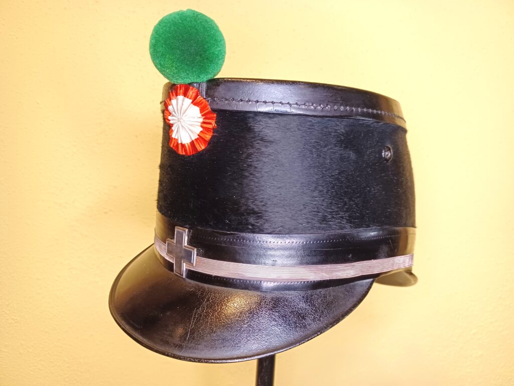 Als Tschako trug er einen Offizierstschako der Ordonnanz 1875. Dieser war mit einem hellgrünen Pompon, einer blechernen, eidgenössischen Kokarde, dem silbernen Gradabzeichen und der silbernen Einheitsnummer «4» geschmückt.