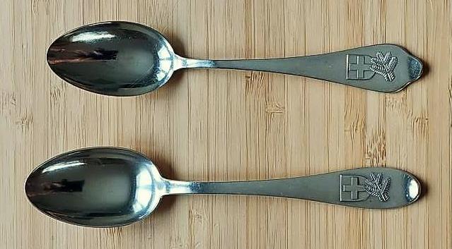 Die Löffel der beiden Firmen unterscheiden sich in Gewicht, Form und Herstellungsverfahren. Gemein ist ihnen, dass sie aus massivem «800er» Silber bestehen. Dabei handelt es sich um eine Legierung aus 80% Silber und 20% Kupfer. Beide Löffel tragen auf der Vorderseite das Schweizer Wappen mit einem Tannenzweig und auf der Rückseite den dreisprachigen Text.