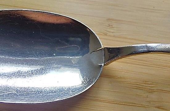 Der Löffel von Huguenin wurde aus zwei Teilen hergestellt. Laffe und Stiel wurden gesondert ausgeformt und anschliessend zusammengelötet. Dadurch entstand ein formschöner und zierlicher Löffel. Mit 20.5 Gramm ist er auch deutlich leichter als der Jezler-Löffel. Leider hat darunter jedoch die Alltagstauglichkeit gelitten. Der raue Umgang mit ihm in der Soldatenstube und anschliessend in der Küchenschublade führte zu Beschädigungen. Insbesondere der gelötete Übergang von Laffe zu Stiel ist eine Schwachstelle. Viele Löffel weisen hier Risse auf. Zudem ist es schwierig, einen Löffel zu finden bei dem der Griff nicht verbogen ist.