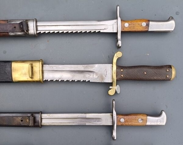- das Dolchbajonett zum Infanteriegewehr, mit gerader Säbelklinge von 300 mm Länge, bronzierte Stahlscheide [Dolchbajonette, Ord. 1889, Ord. 1889/99, Ord. 1899];