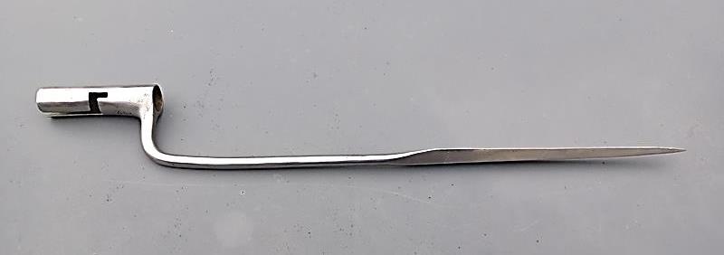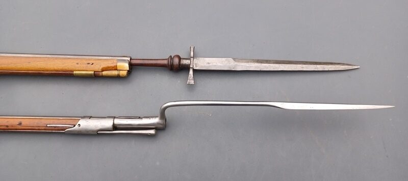 Die typische abgeknickte Form dieser Bajonette hatte einen klaren Zweck. Im Gegensatz zum Spundbajonett, das zum Nachladenden des Gewehres aus dessen Lauf entfernt werden musste, verbleib das Tüllenbajonett dabei auf dem Lauf. Nun waren diese Lunten- und Steinschlossgewehr bekanntlich Vorderlader, das heisst, Pulver und Kugel mussten mit Hilfe des Ladestocks von vorne in den Lauf gestossen werden.