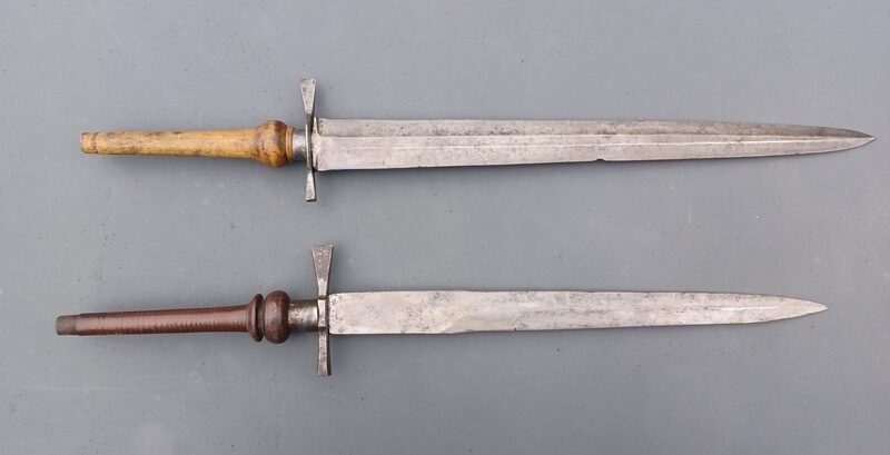 Glatter, dunkelbrauner Holzgriff, Verdickung mit feinem Rillendekor, Nietscheibe, Zwinge und Parierstange aus Eisen, ein Parierstangenende als Hammer, das andere als Schraubenzieher ausgebildet, zweischneidige Klinge von linsenförmigem Querschnitt, abgerundete Spitze, keine Marken.