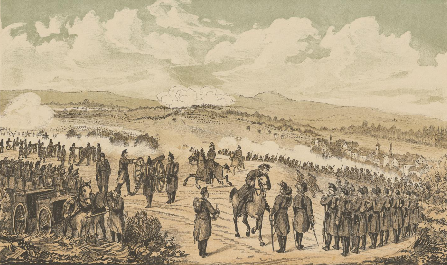 - Druckgrafik aus: Erinnerungen an die Manöver der VI. Division (Egloff) zwischen der Thur und dem Rhein, vom 11.-13. September 1882, von G. Wassermann, Zürich, 1882. ↩︎