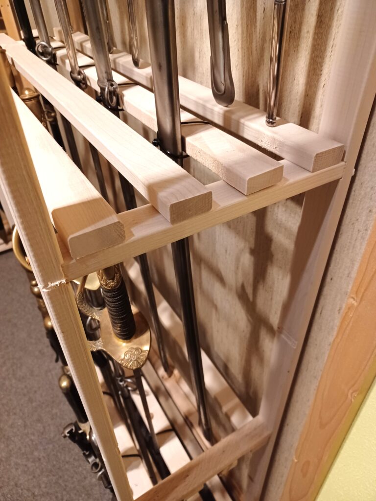 So, fertig ist das Blankwaffengestell. Auf einer Bodenfläche von 80 x 30 cm und zu einem Preis von unter 30 Franken, sind nun eine beachtliche Anzahl von Griffwaffen schön präsentiert und zur Bewunderung freigegeben. Natürlich können mit solchen Holzregalen auch noch weitere Präsentationen verwirklicht werden. Der Phantasie sind hierbei keine Grenzen gesetzt.
